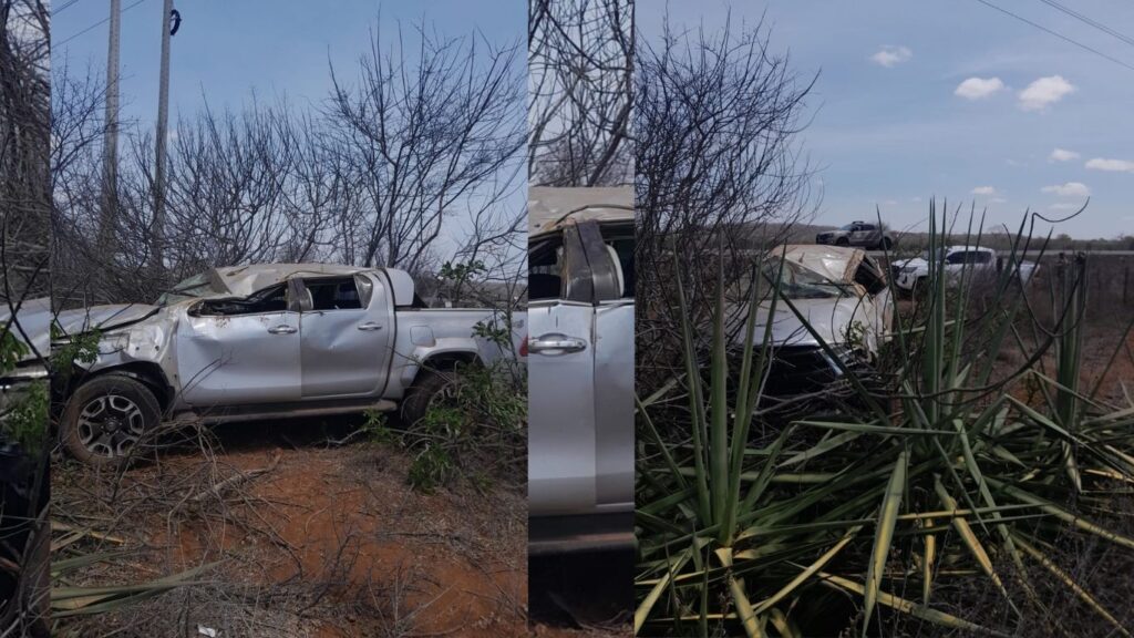 De acordo com informações apuradas no local, o condutor de uma caminhonete perdeu o controle da direção após ser surpreendido por caprinos soltos na pista. O veículo saiu da via e capotou, ficando imobilizado fora da faixa de rolamento, em área de vegetação às margens da rodovia.