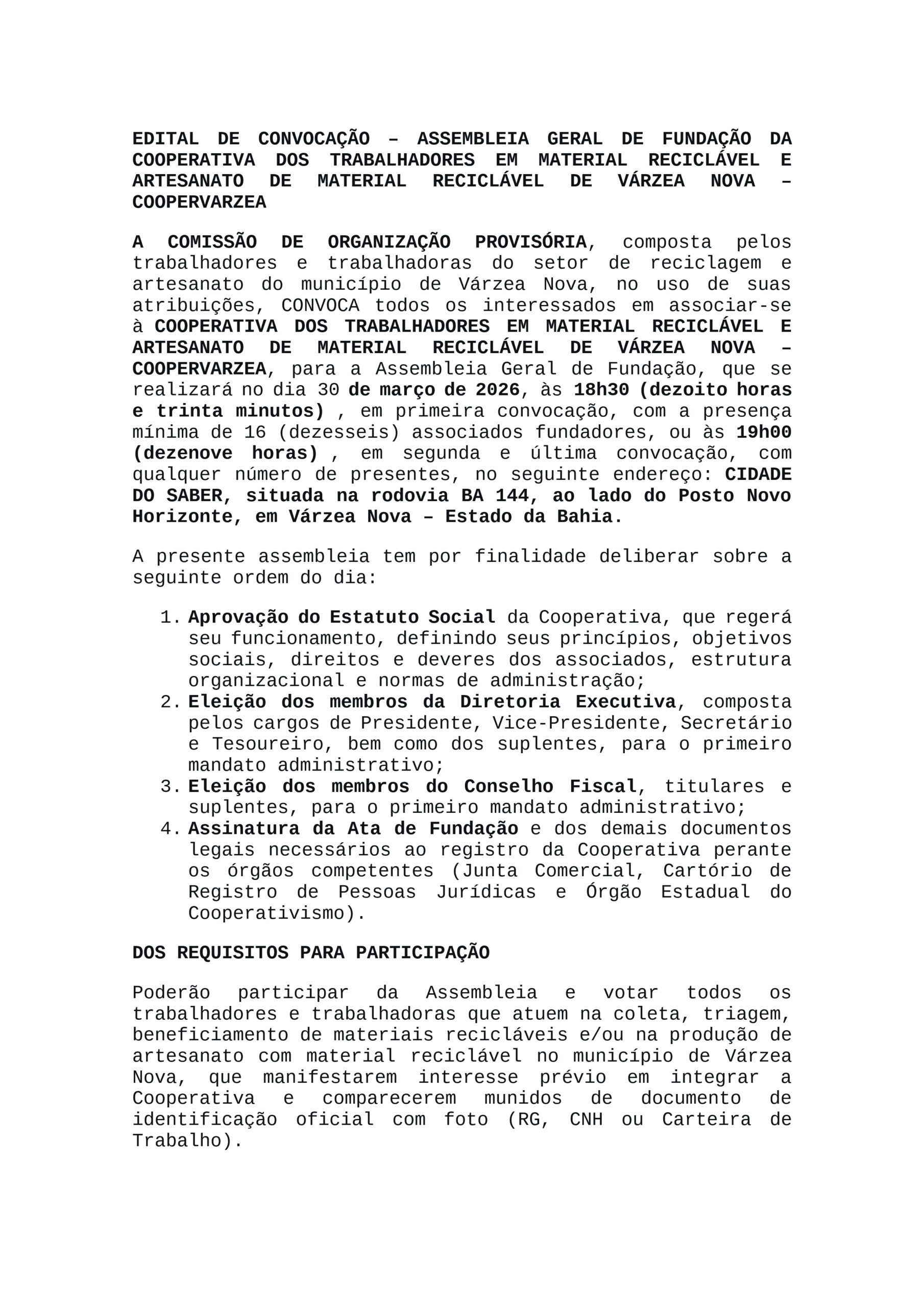 A Comissão de Organização Provisória, composta por trabalhadores e trabalhadoras do setor de reciclagem e artesanato de Várzea Nova, convoca todos os interessados a se associarem à Cooperativa dos Trabalhadores em Material Reciclável e Artesanato de Material Reciclável de Várzea Nova – Coopervárzea.