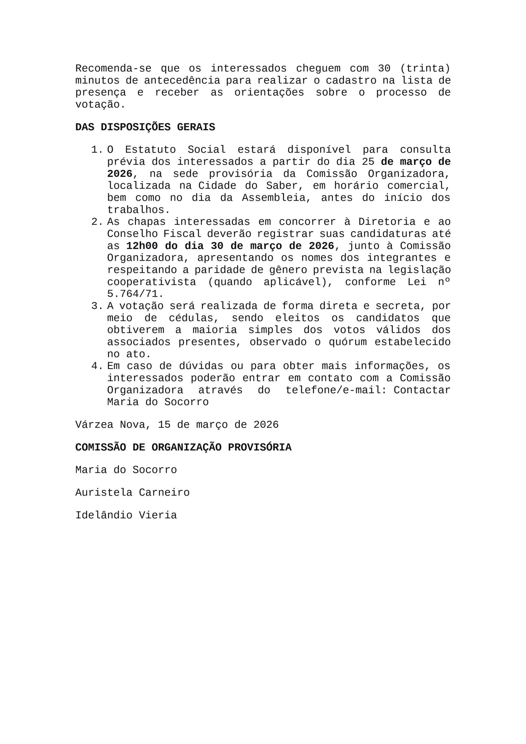 O Estatuto Social estará disponível para consulta a partir do dia **25 de março de 2026**, na sede provisória da Comissão Organizadora e no dia da Assembleia. Chapas interessadas em concorrer à Diretoria e ao Conselho Fiscal devem registrar candidaturas até às **12h00** do dia 30 de março, respeitando a paridade de gênero conforme a legislação cooperativista.
