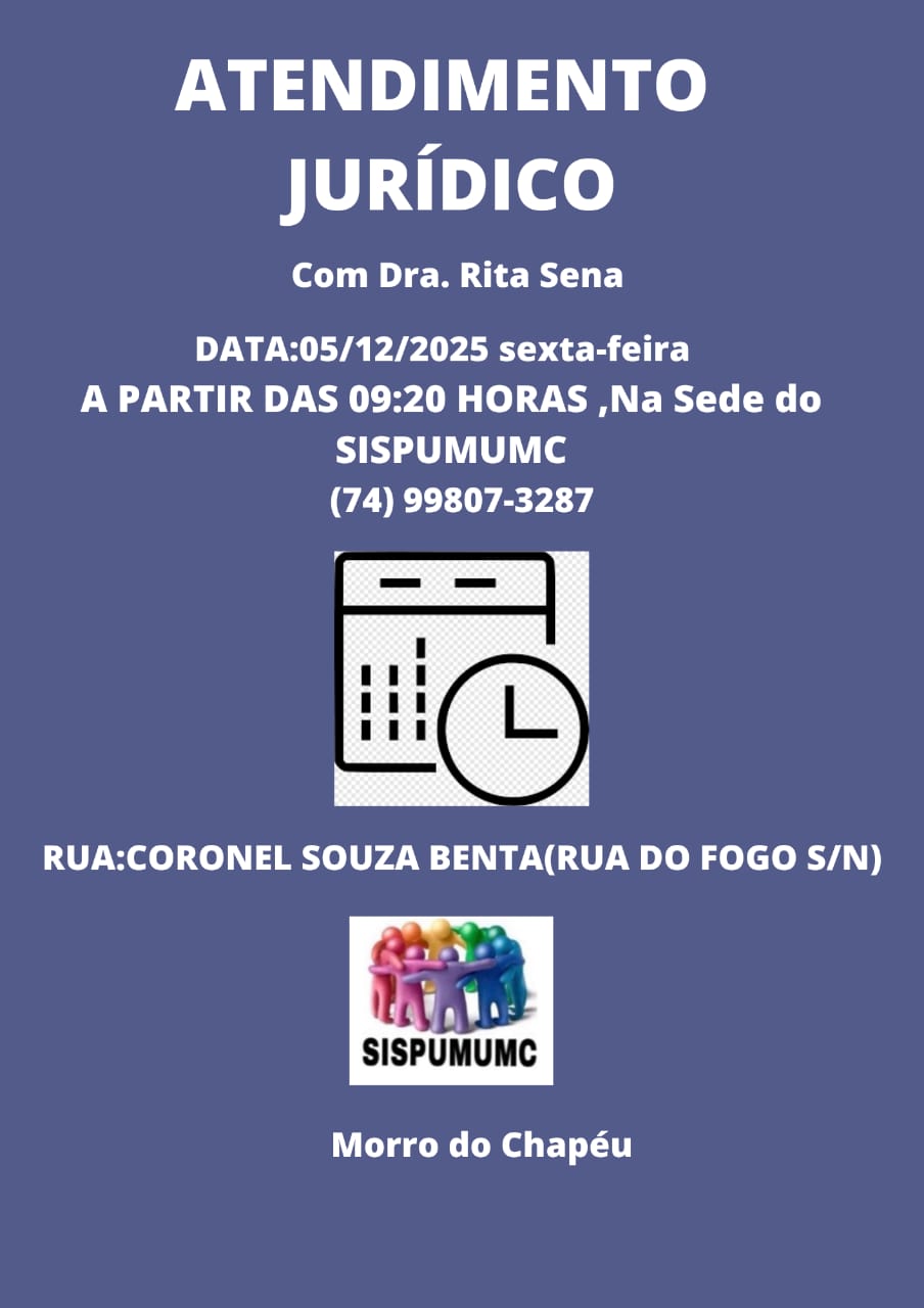 O Sindicato dos Servidores Públicos do Município de Morro do Chapéu – BA (SISPUMUMC), informa que, nesta sexta-feira, 05 de dezembro de 2025, a advogada sindical Drª Rita Sena estará atendendo, a partir das 09:20h, na sede do Sindicato, à rua Cel. Souza Benta, S/N – Rua do Fogo.
