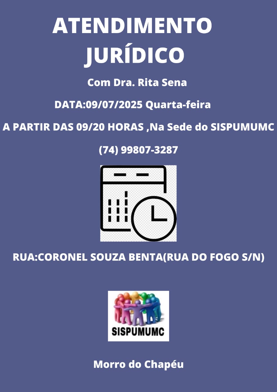 O Sindicato dos Servidores Públicos do Município de Morro do Chapéu – BA (SISPUMUMC), informa que, nesta quarta-feira, 09 de JULHO de 2025, a advogada sindical DRª Rita Sena estará atendendo, a partir das 09:30h, na sede do Sindicato, à rua Cel. Souza Benta, S/N – Rua do Fogo.