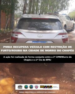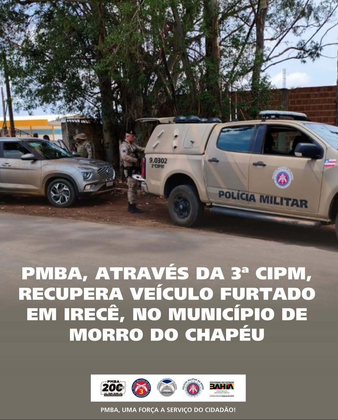 Por volta das 11h20 deste sábado, 08, a guarnição do Posto 2.4/1 da 2ª Cia do BPRv foi acionada pelo CICOM/Irecê, após sistema de videomonitoramento identificar um Hyundai/Creta, com registro de furto na cidade de Irecê em 07/11/2025, trafegando pela BA-052, nas proximidades do Km 271, sentido Morro do Chapéu.