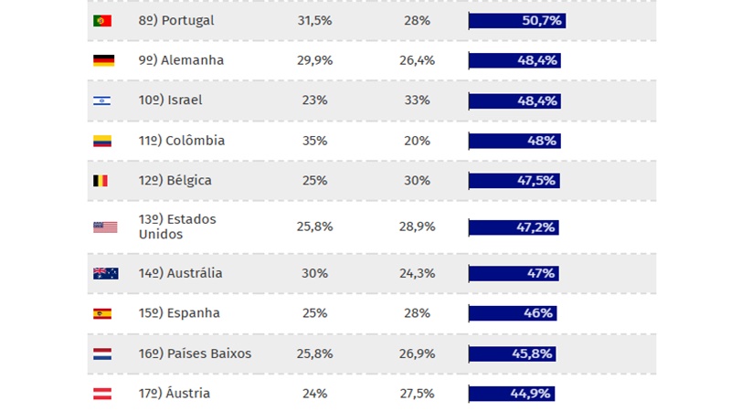 Fato é que a média dos 38 membros da OCDE por esse critério sobe para 42%. Veja aqui onde o Brasil se encontra na comparação com eles: