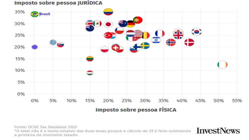 Somando tributação sobre pessoas físicas e jurídicas, o país está longe do topo na lista dos países que mais cobram impostos