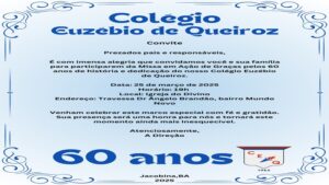 LRN registra com muita alegria o convite encaminhado pelo amigo Lourival Jr. Para a celebração dos 60 anos do renomado Colégio Euzébio de Queiroz, em