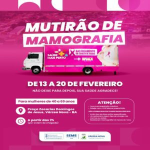 🚨 ATENÇÃO, MULHERES DE VÁRZEA NOVA!🚨 O Mutirão de Mamografia já começou na Praça Zacarias Domingos de Jesus, trazendo mais saúde e prevenção para todas!