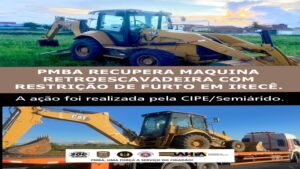 PMBA — COPPM — CPME— CIPE/SEMIÁRIDO RECUPERAÇÃO DE MÁQUINA RETROESCAVADEIRA COM RESTRIÇÃO DE FURTO Data: 28 Jan 2025 Horário: 17h30 Local: IRECÊ/BA RESUMO: A Guarnição