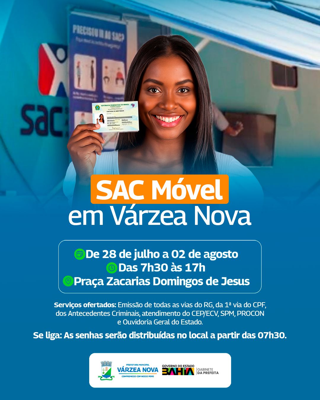 De 28/07 a 02/08, o SAC Móvel estará em nossa cidade oferecendo vários serviços pra facilitar sua vida!