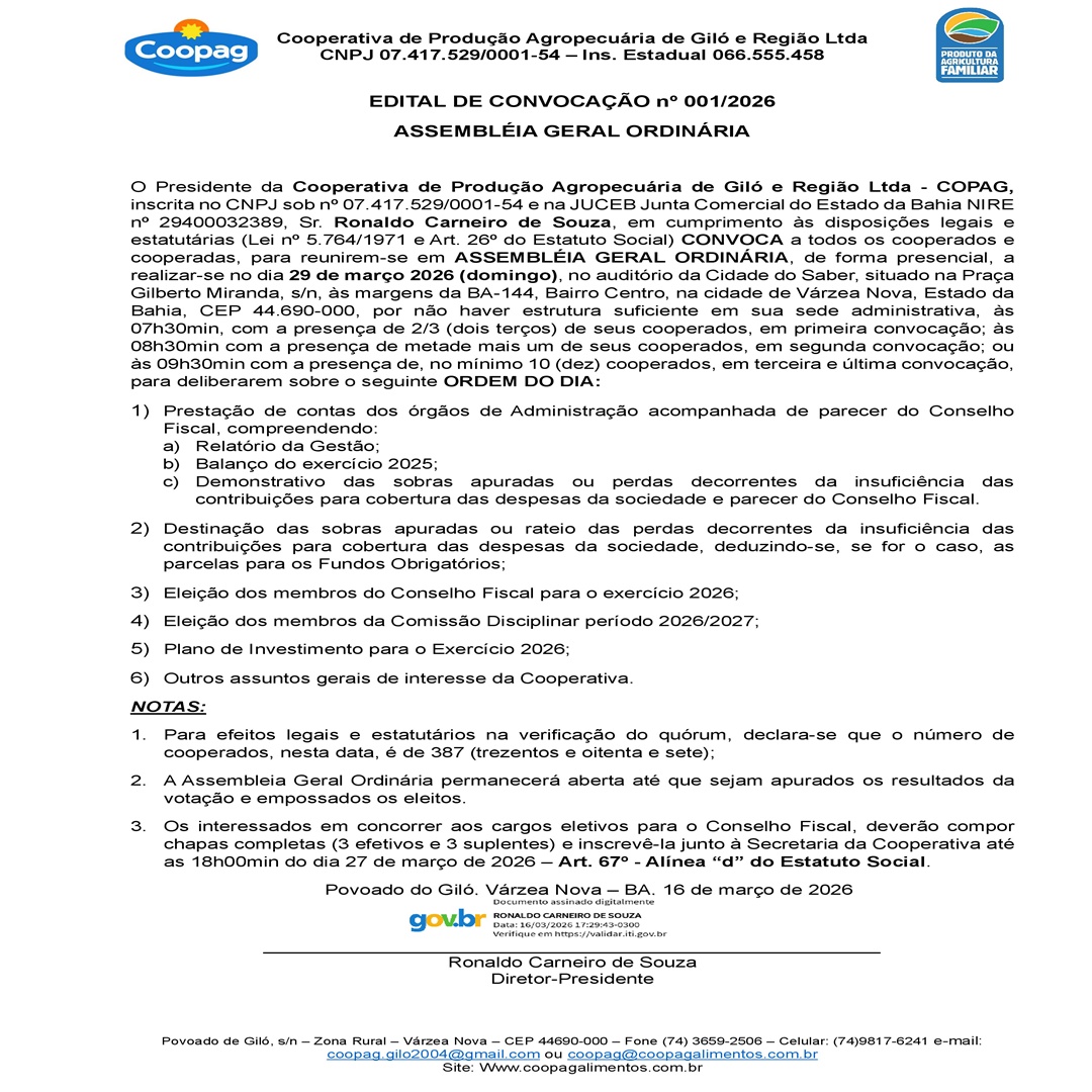 O Presidente da Cooperativa de Produção Agropecuária de Giló e Região Ltda – COPAG, inscritano CNPJ sobnº 07.417.529/0001-54 enaJUCEBJunta ComercialdoEstadodaBahiaNIRE nº 29400032389, Sr. Ronaldo Carneiro de Souza, em cumprimento às disposições legais e estatutárias (Lei nº 5.764/1971 e Art. 26º do Estatuto Social) CONVOCA a todos os cooperados e cooperadas, para reunirem-se em ASSEMBLÉIA GERAL ORDINÁRIA, de forma presencial, a realizar-se no dia 29 de março 2026 (domingo), no auditório da Cidade do Saber, situado na Praça Gilberto Miranda, s/n, às margens da BA-144, Bairro Centro, na cidade de Várzea Nova, Estado da Bahia, CEP 44.690-000, por não haver estrutura suficiente em sua sede administrativa, às 07h30min, com a presença de 2/3 (dois terços) de seus cooperados, em primeira convocação; às 08h30min com a presença de metade mais um de seus cooperados, em segunda convocação; ou às 09h30min com a presença de, no mínimo 10 (dez) cooperados, em terceira e última convocação, para deliberarem sobre o seguinte ORDEM DO DIA: