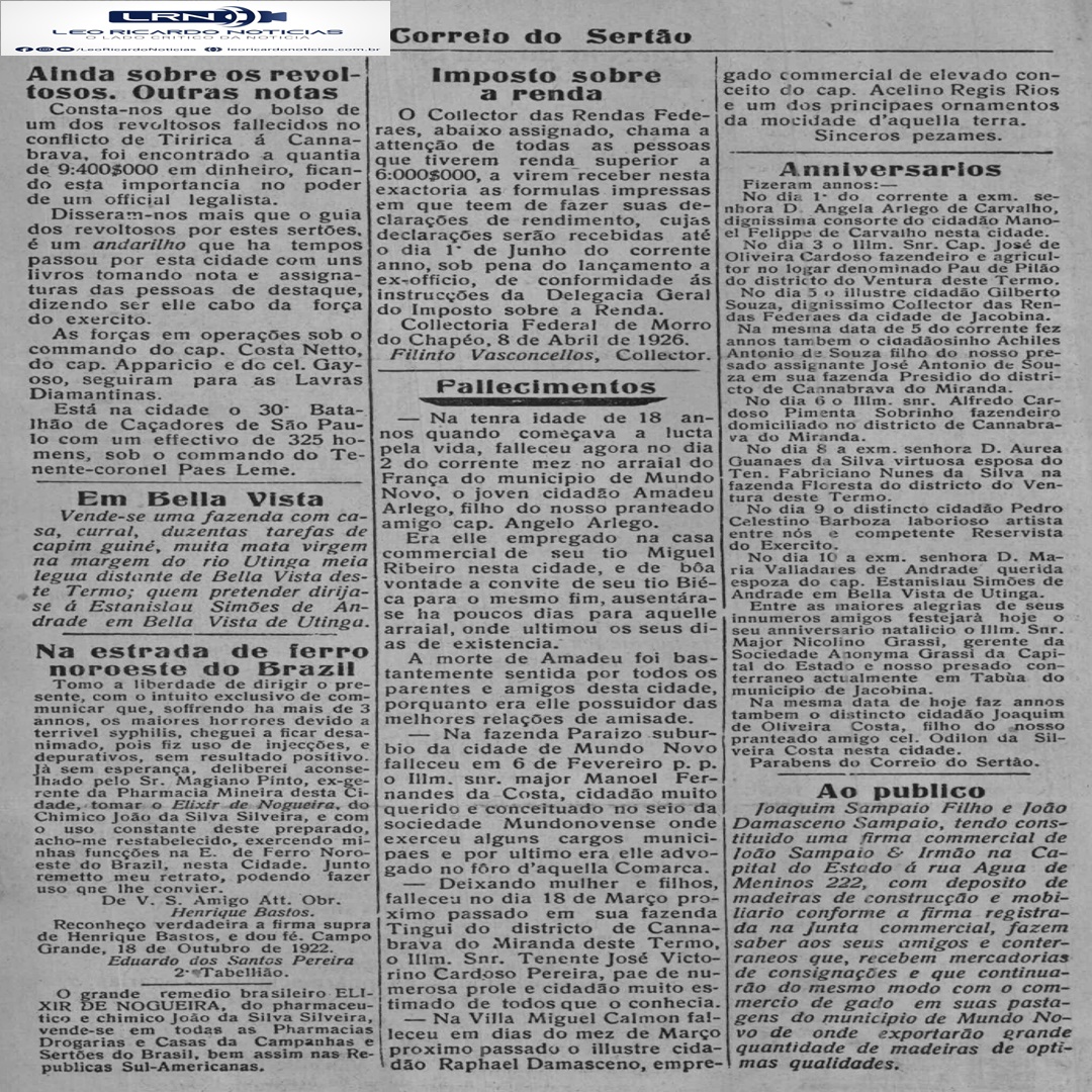 Nosso leitores estão habituados a ter, todo sábado ou domingo, edições completas do noticiosos mais antigo do Interior Baiano, em circulação ininterrupta, com pelo menos cem anos de edição.