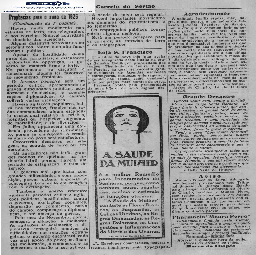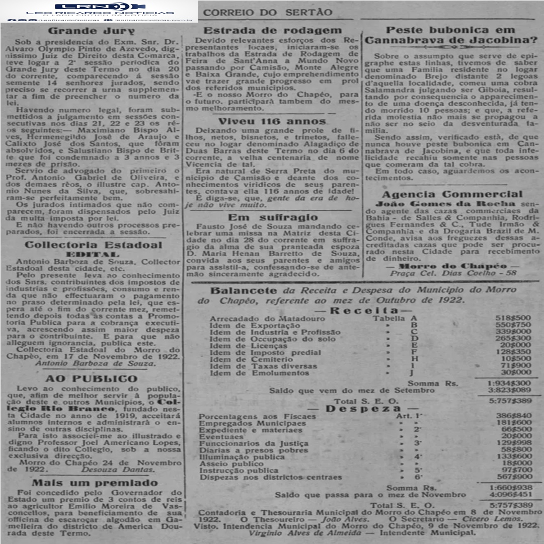 Veremos hoje: Viveu 116 anos em Duas Barras (Nov. 1922) – O Morro do Chapéo e suas riquezas naturais (Ago. 1923) – A Voz do Espaço… O Morro do Chapéo e a sua estrela (Set. 1923)