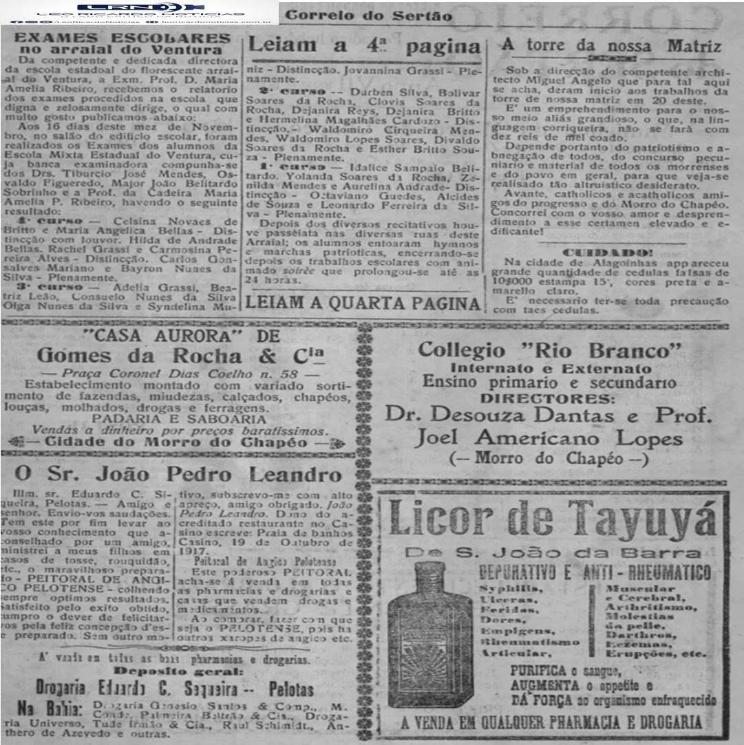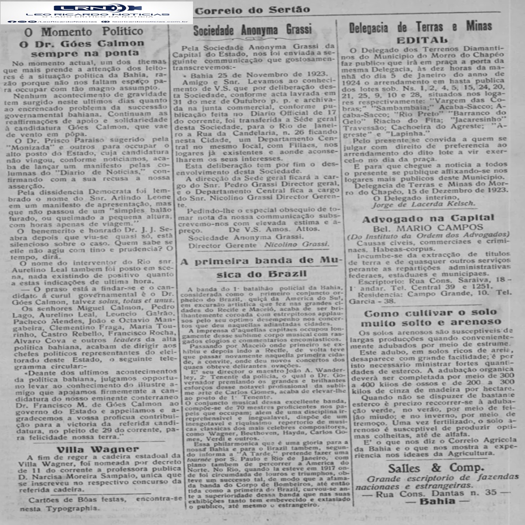 Veremos hoje: A torre de nossa Matriz (Nov. 1923) – É caso sério… A falta de troco na Bahia – A primeira Banda de Música do Brasil (Dez. 1023) – Anúncios (Set. 1923)