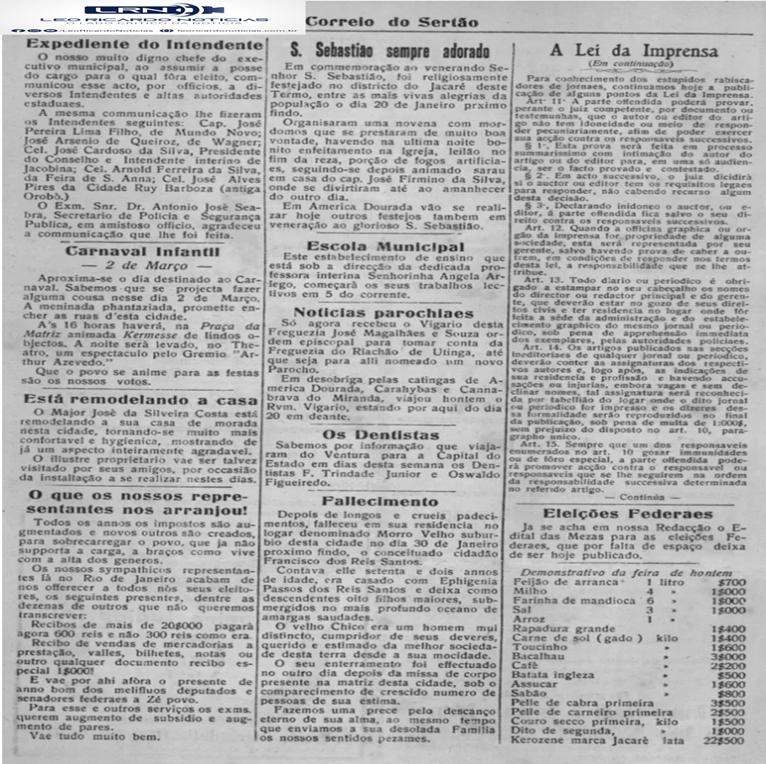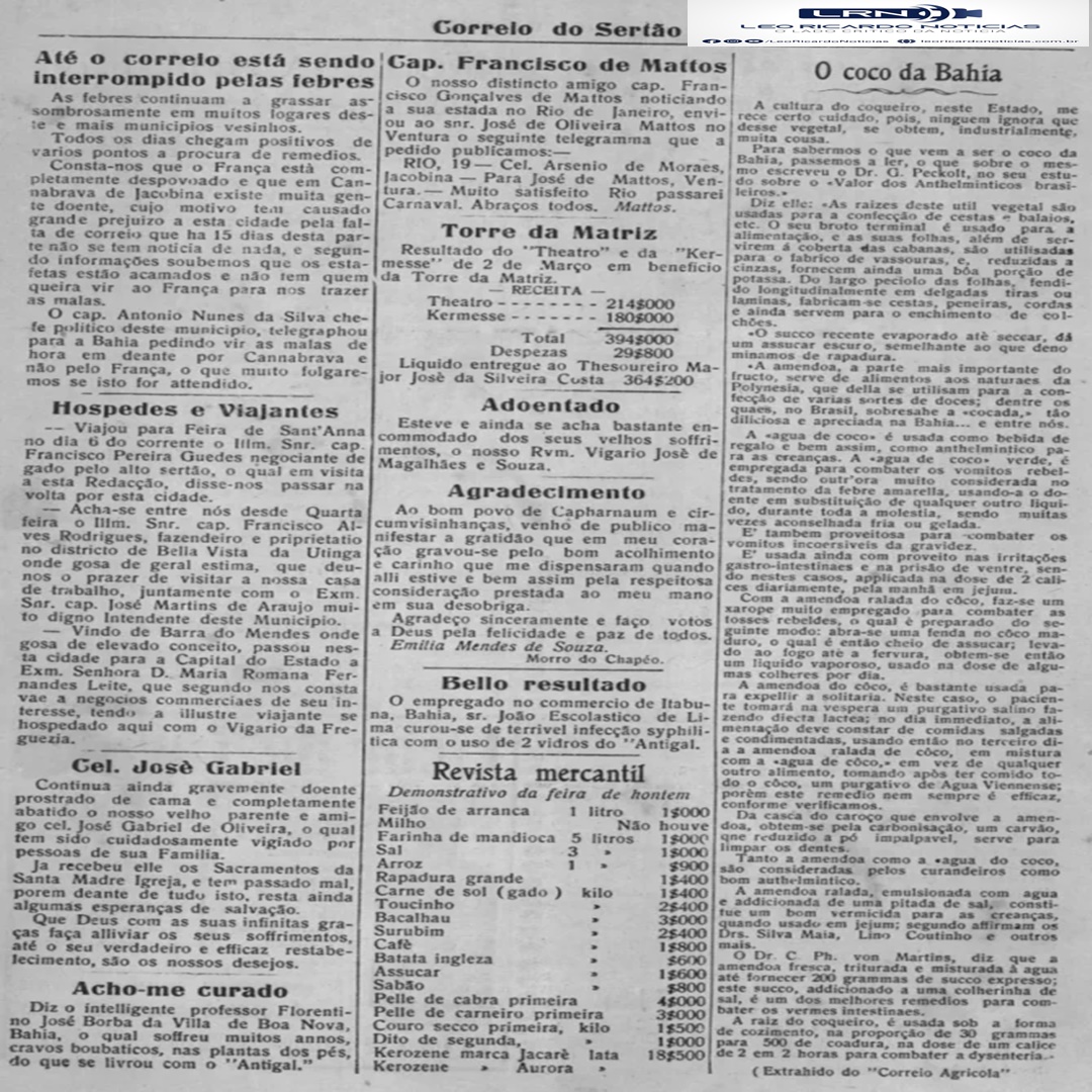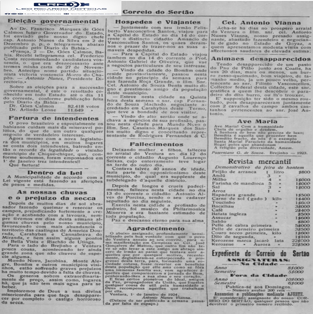 Veremos hoje: Animais desaparecidos – As nossas chuvas e o prejuizo da seca (Jan.1924) – O que os nossos representantes nos arranjou (Fev. 1924) – Até o Correio está sendo interrompido pelas febres ( Marc. 1924)