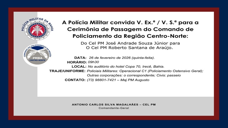 A Polícia Militar da Bahia realizará, na próxima quinta-feira, a Cerimônia de Passagem do Comando do Comando de Policiamento da Região Centro Norte. O ato solene marcará a transmissão do cargo do Cel PM José Andrade Souza Júnior para o Cel PM Roberto Santana de Araújo.