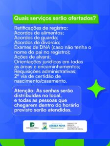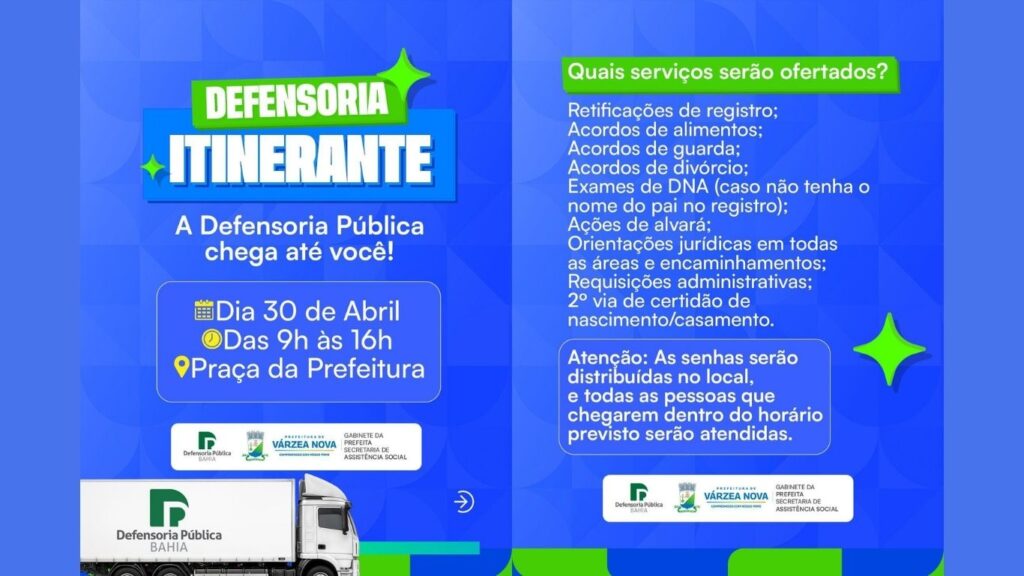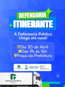 A população de Várzea Nova terá acesso a uma série de serviços jurídicos gratuitos no próximo dia 30 de abril, com a chegada da Unidade Móvel da Defensoria Pública. A ação será realizada das 9h às 16h, na Praça da Prefeitura, e promete ampliar o acesso à Justiça para moradores do município.