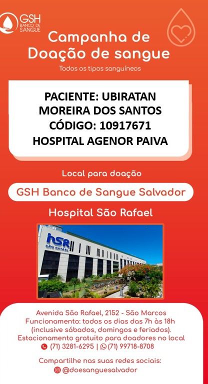 O amigo e colega comunicador, Ubiratan Moreira está precisando de doações de sangue em Salvador