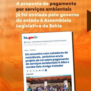O Governo do Estado encaminhou à Assembleia Legislativa a proposta de pagamento por serviços ambientais aos catadores e catadoras. Essa é uma conquista construída ao longo de muitos anos de mobilização e resistência, especialmente pelos movimentos sociais que atuam junto a esses trabalhadores e trabalhadoras.