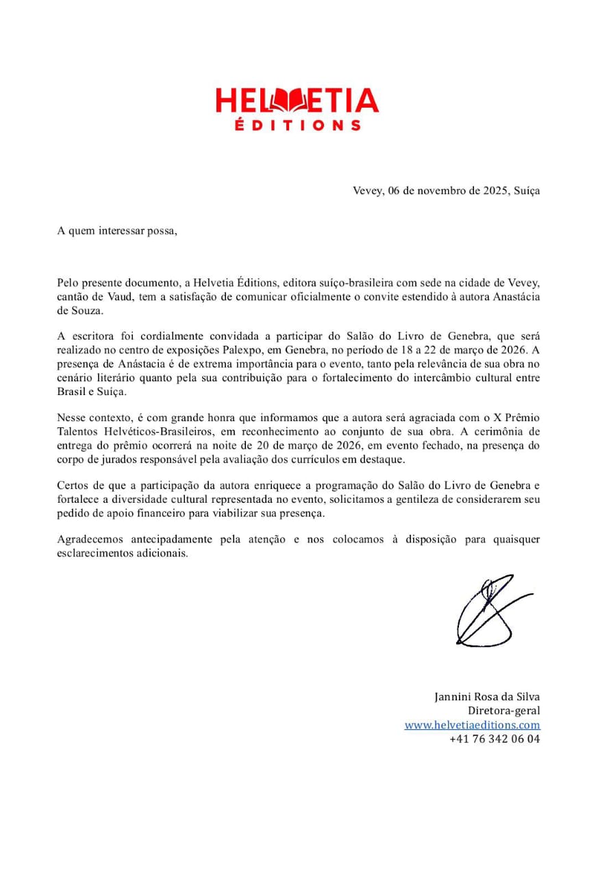 Recentemente, Anastácia recebeu um convite para participar do Salão do Livro em Genebra na Suíça, um dos mais importantes eventos literários internacionais, onde apresentará sua obra e representará sua história de superação.