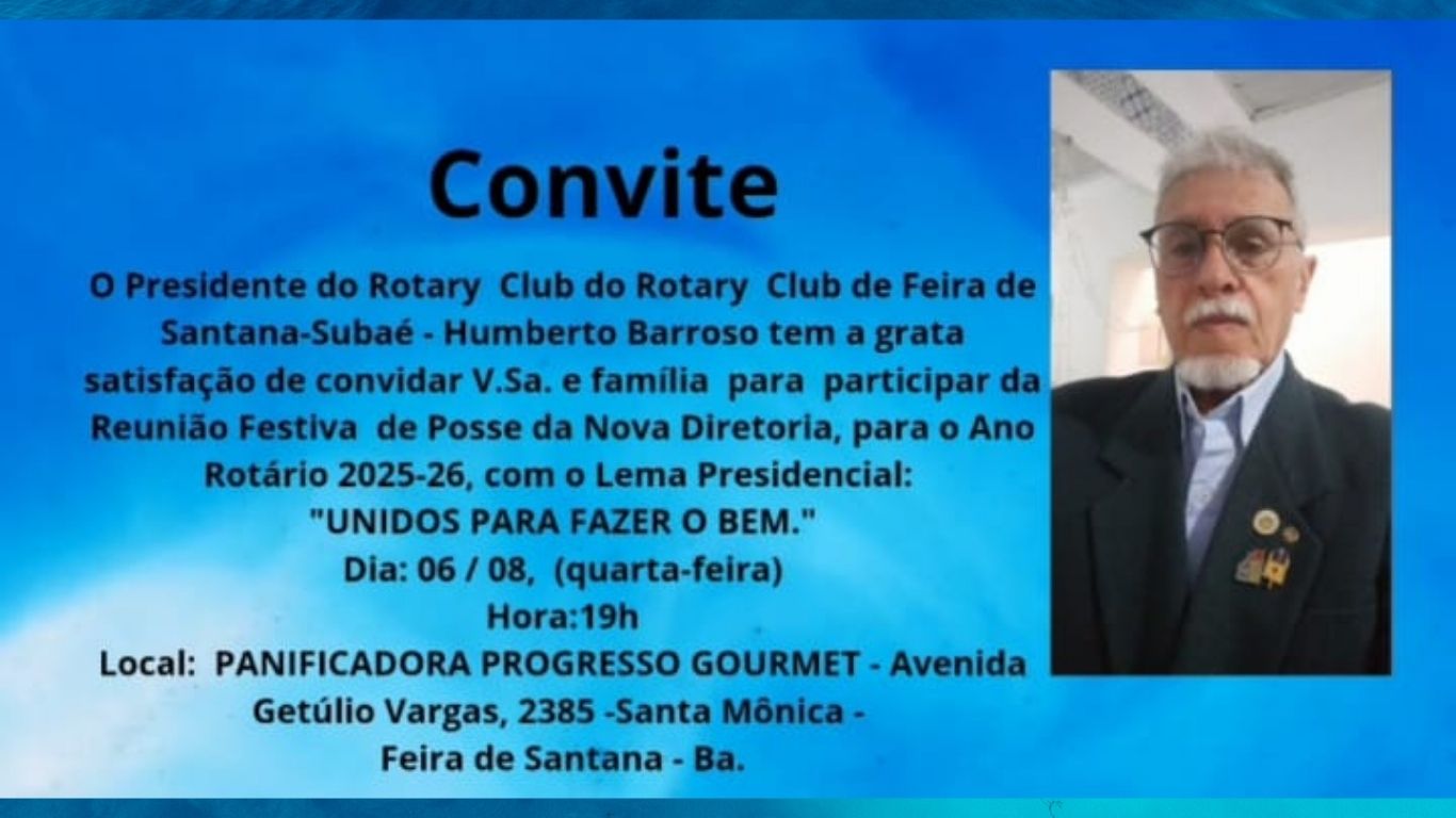 Com muita alegria, LRN registra o convite do amigo Humberto Barroso, para a Festa de Posse da nova diretoria do Rotary Club de Feira de Santana – BA, para o ano rotário 2025/26, com o Lema Presidencial: “Unidos para fazer o bem’.