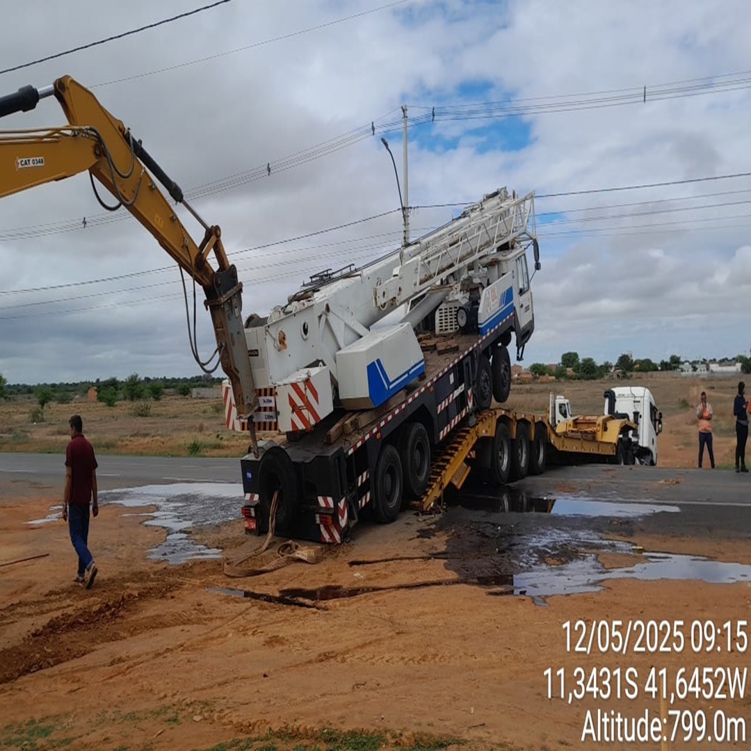 Nas imagens, é possível observar o caminhão-guindaste parcialmente fora da prancha, indicando que o veículo teria escorregado da estrutura durante o trajeto. Informações preliminares apontam que o guindaste se deslocou da base da prancha e teve o toque hidráulico danificado, comprometendo parte de seu funcionamento.