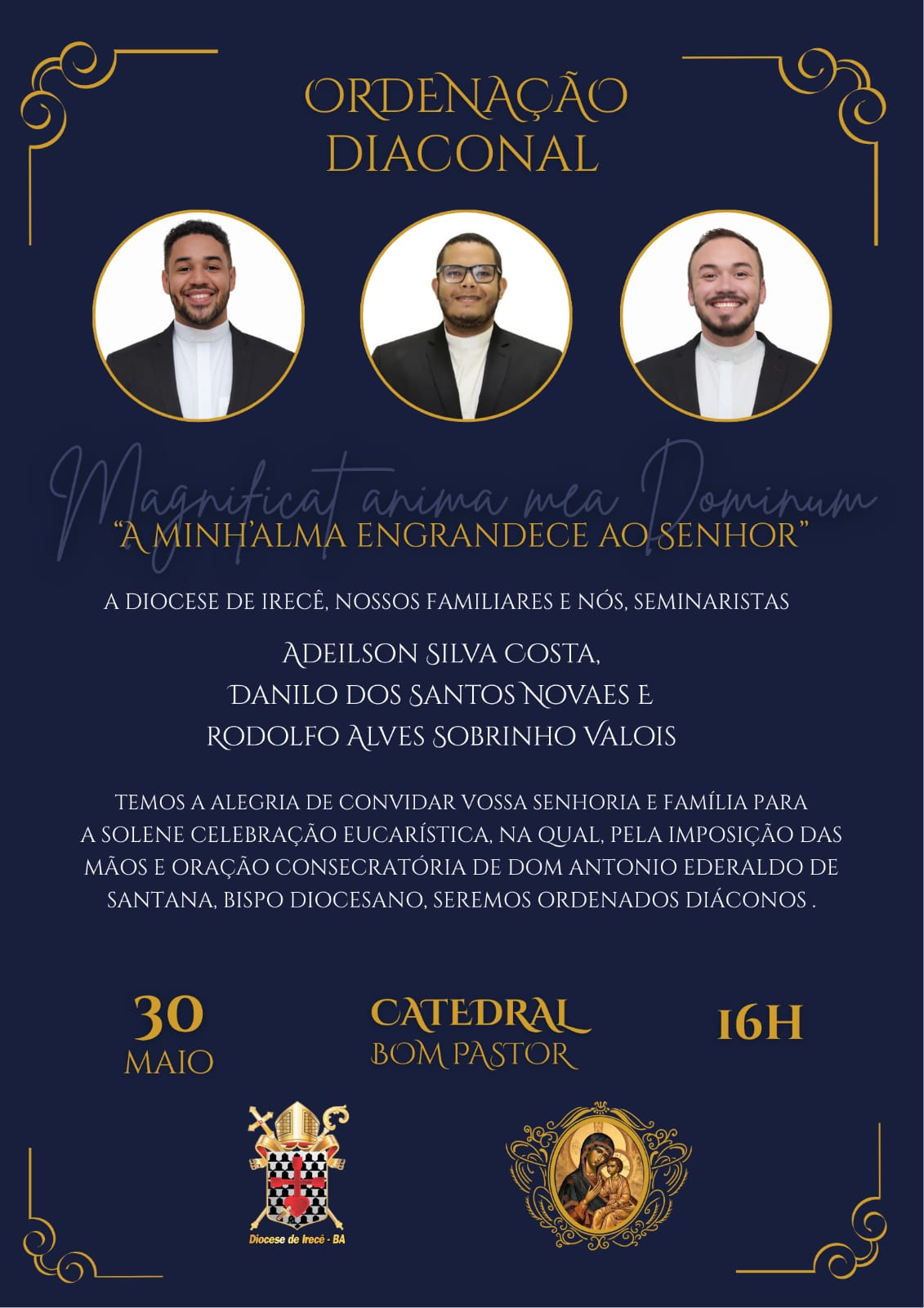 No dia 30 de maio, em Irecê, acontecerá a ordenação Diaconal dos Seminaristas Adeilson, Rodolfo e Danilo.