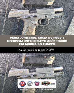 A Polícia Militar da Bahia, por meio da 3ª CIPM, realizou a apreensão de uma arma de fogo e a recuperação de uma motocicleta roubada, na tarde deste domingo (29), no povoado de Tamboril, zona rural de Morro do Chapéu.
