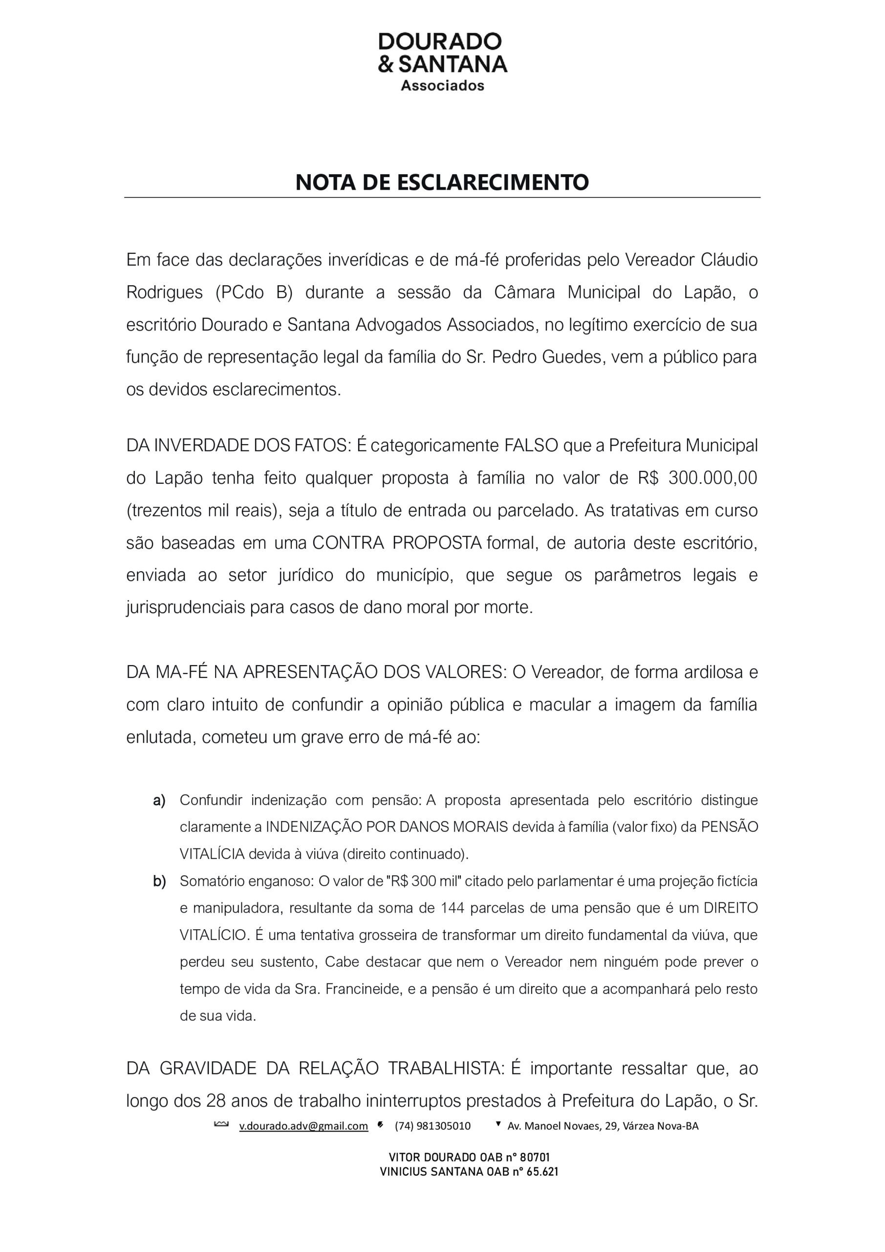 Em face das declarações inverídicas e de má-fé proferidas pelo Vereador Cláudio Rodrigues (PCdo B) durante a sessão da Câmara Municipal do Lapão, o escritório Dourado e Santana Advogados Associados, no legítimo exercício de sua função de representação legal da família do Sr. Pedro Guedes, vem a público para os devidos esclarecimentos.