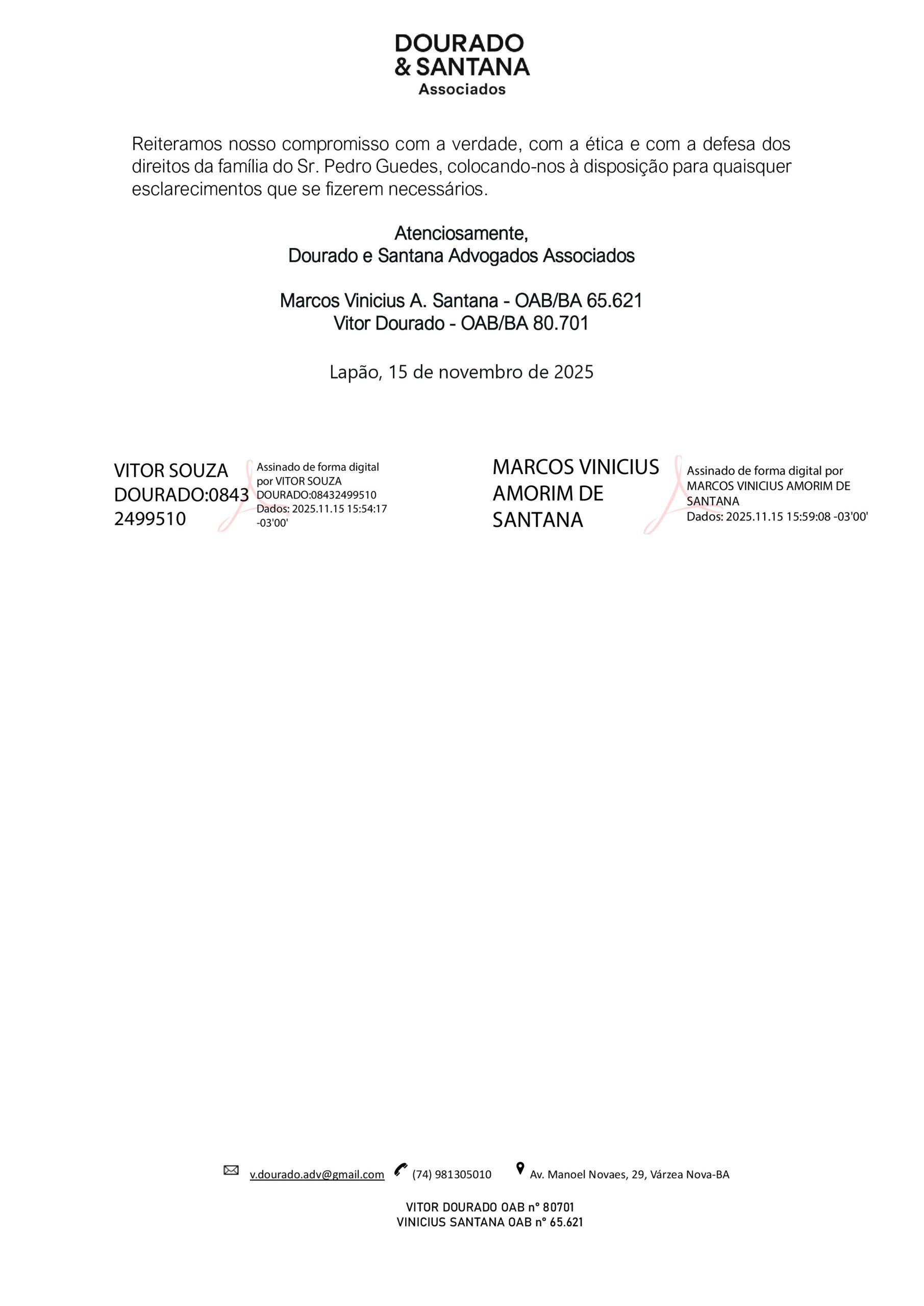 Reiteramos nosso compromisso com a verdade, com a ética e com a defesa dos direitos da família do Sr. Pedro Guedes, colocando-nos à disposição para quaisquer esclarecimentos que se fizerem necessários.