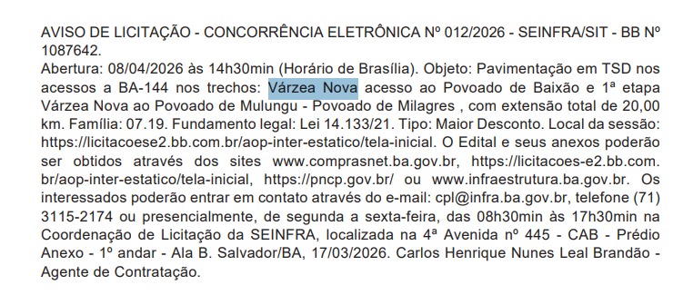 A prefeita de Várzea Nova, Daiane Pereira, comemorou nesta quarta-feira (18) o anúncio da abertura do processo de licitação, por parte do Governo da Bahia, para a pavimentação em Tratamento Superficial Duplo (TSD) em importantes acessos do município. A concorrência eletrônica está marcada para o dia 8 de abril, às 14h30, e contempla a ligação da sede de Várzea Nova ao povoado de Mulungu, seguindo até o povoado de Milagres, com extensão total de cerca de 20 quilômetros.