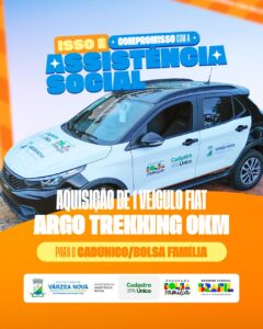Na tarde da última terça-feira, 03 de fevereiro, a Prefeitura de Várzea Nova realizou a entrega de um veículo Fiat Argo Trekking 0KM, dando mais um passo importante na ampliação e modernização da frota municipal. O novo veículo será fundamental para o fortalecimento das atividades e dos atendimentos da Secretaria de Assistência Social, especialmente nas ações voltadas ao Programa Bolsa Família e ao CadÚnico, garantindo mais agilidade, eficiência e qualidade no atendimento à população.