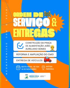 A Prefeitura de Várzea Nova realizará nesta sexta-feira, 14 de novembro, às 10h, na Praça da Antiga Feirinha, a cerimônia oficial de assinatura das Ordens de Serviço para a construção da Praça de Alimentação João Aureliano Gomes e para a reforma e ampliação do Centro Municipal de Educação Infantil (CMEI).