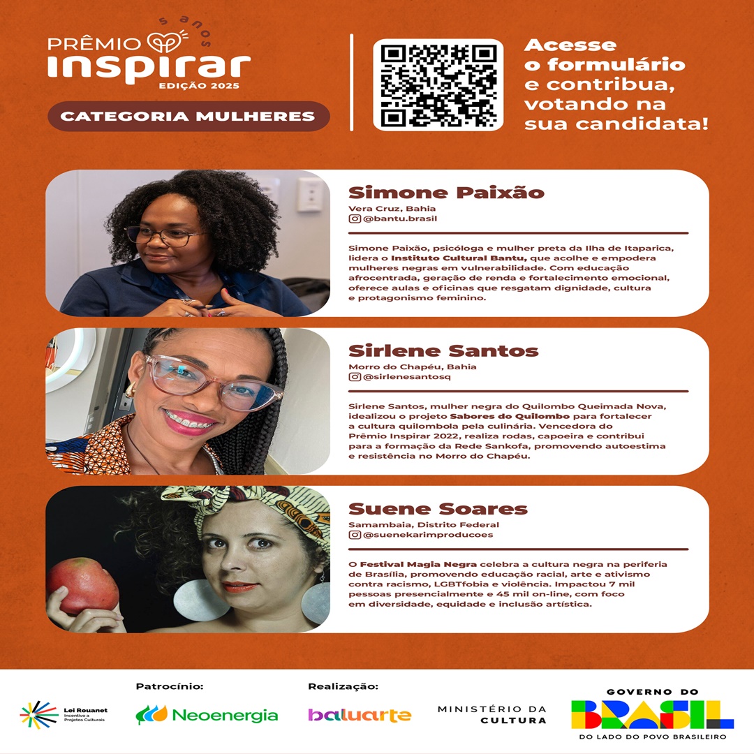 O Prêmio Inspirar chega à sua 5ª edição com foco exclusivo em reconhecer e potencializar iniciativas de lideranças femininas negras, cisgênero ou transgênero que atuam com arte e cultura em seus territórios.