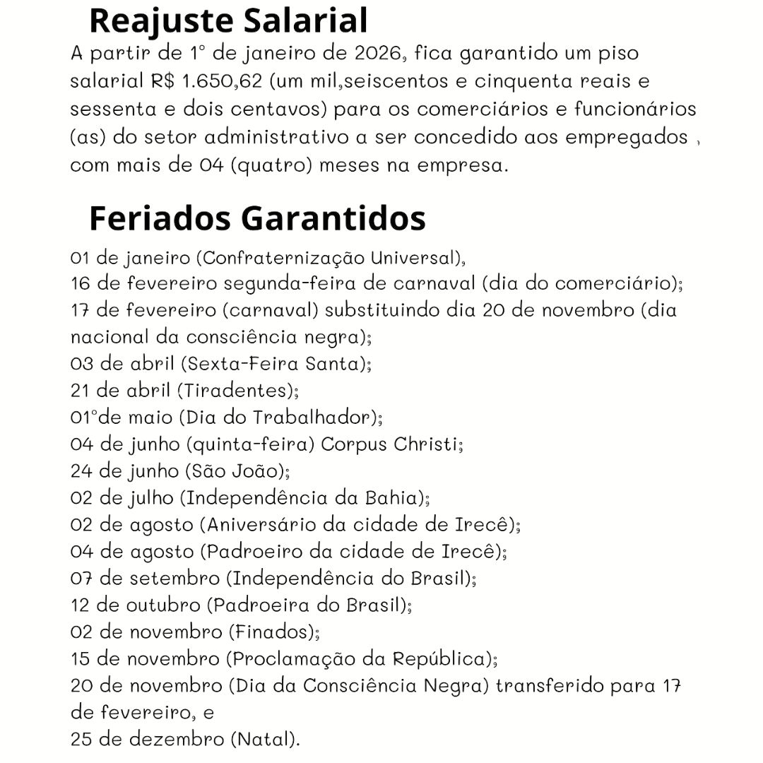 No ultimo Sábado foi assinado a convenção coletiva que regulamenta o trabalho do comercio atacadista, varejista , de bens e serviços de Irecê e Região. Mais um avanço para a classe trabalhadora de nosso território!
