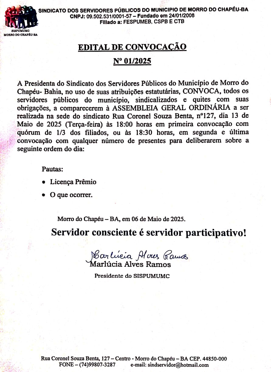 A Presidenta do Sindicato dos Servidores Públicos do Município de Morro do Chapéu – BA, no uso de suas atribuições estatutárias, CONVOCA, todos os servidores públicos do município, sindicalizados e quites com suas obrigações, comparecerem à ASSEMBLEIA GERAL EXTRAORDINÁRIA a ser realizada n sede do sindicato: rua Coronel Souza Benta – rua do fogo, 127, dia 13 de maio de 2025 (terça-feira), às 18h em primeira convocação, com quórum de 1/3 dos filiados ou às 18:30h, em segunda e última convocação, com qualquer número de presentes, para deliberarem sobre e a seguinte ordem do dia: