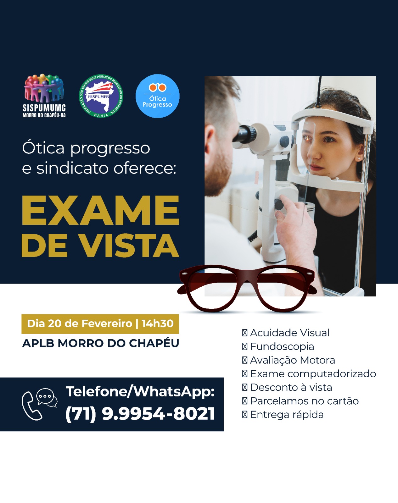 O SISPUMUMC, em parceria com a ÓTICA PROGRESSO, informa a realização de EXAME DE VISTA.