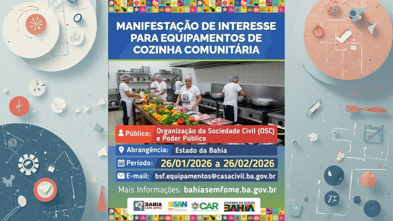 Está aberta a Manifestação de Interesse para a entrega de equipamentos de cozinhas comunitárias em toda a Bahia. É uma oportunidade para fortalecer quem já cuida do povo e leva comida para quem mais precisa. 📅 Inscrições de 26/01 a 26/02 👥 Público: Organizações da Sociedade Civil e Poder Público 📍 Vale para toda a […]