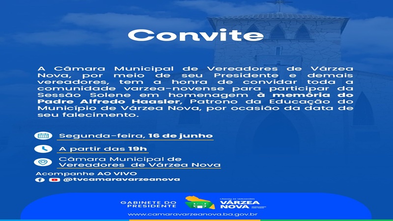 📢 Sessão Solene | 16 de junho de 2025 A Câmara de Vereadores convida toda a comunidade para a Sessão Solene em homenagem à memória do Padre Alfredo Haasler. 🕖 Segunda-feira, às 19h 📍 Plenário da Câmara 📺 Transmissão ao vivo: @tvcamaravarzeanova