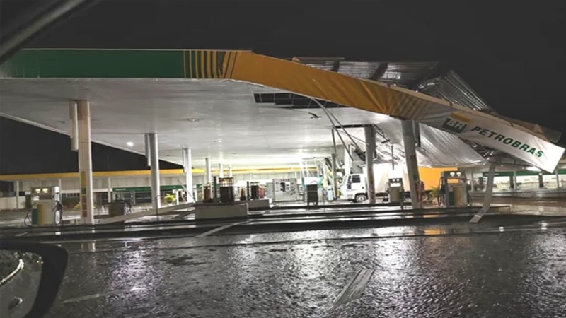 Chuva forte com ventania derruba estrutura de posto na BR-324 em Capim Grosso