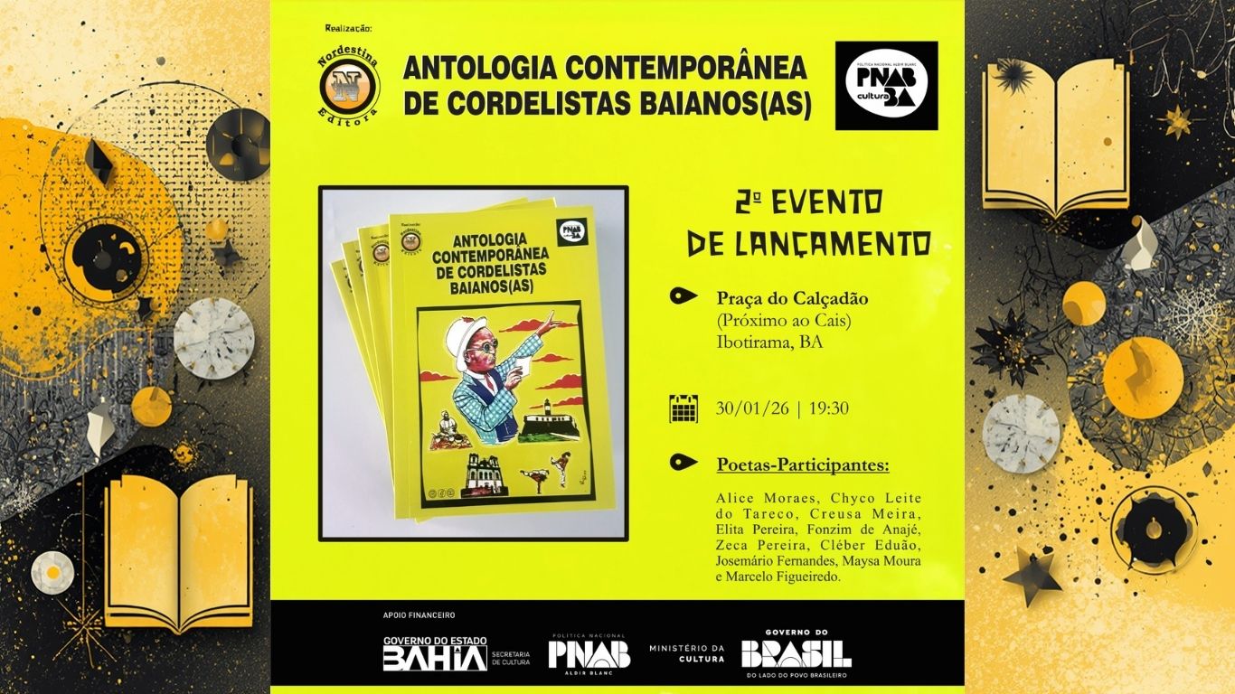 A Nordestina Editora tem a honra de anunciar que o segundo evento de Lançamento da Antologia Contemporânea de Cordelistas Baianos será dia 30/01/26, às 19:30, na Praça do Calçadão (próximo do Cais), em Ibotirama. Poetas Participantes do Lançamento em Ibotirama: Alice Moraes, Chyco Leite do Tareco, Creusa Meira, Elita Pereira, Fonzim de Anajé, Zeca Pereira, […]