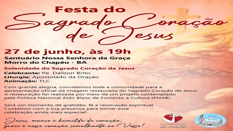 Com grande alegria, a Paróquia Nossa Senhora da Graça convida toda a comunidade para a apresentação oficial da imagem restaurada do Sagrado Coração de Jesus. A restauração foi realizada por meio de um projeto contemplado pela Política Nacional Aldir Blanc de Fomento à Cultura (PNAB). Será um momento de gratidão, fé e renovação espiritual. Contamos […]