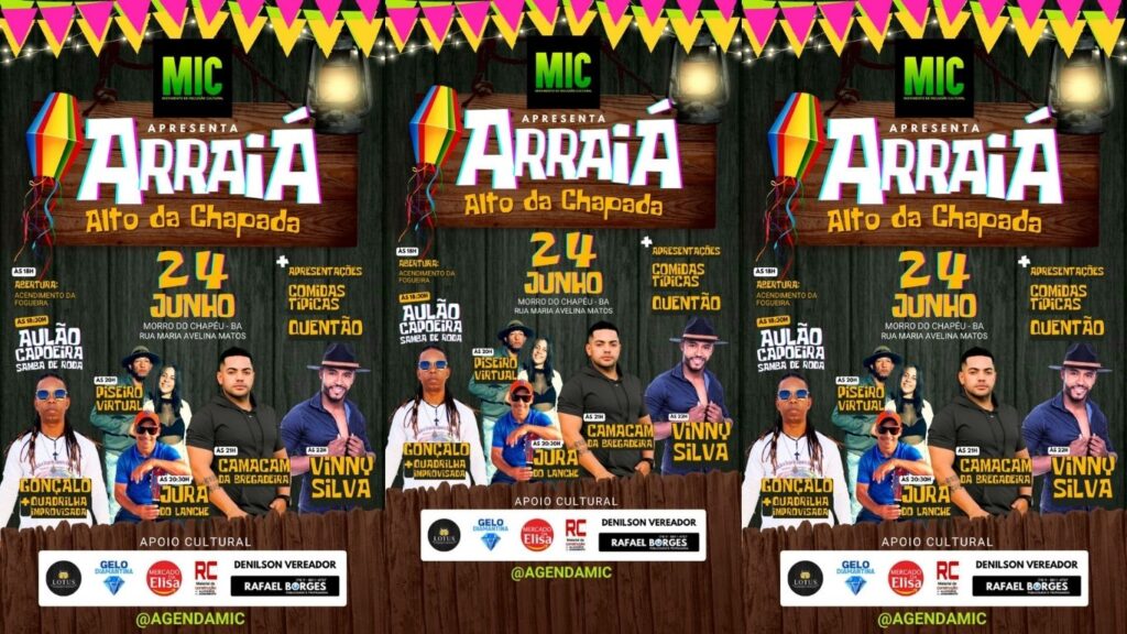 🎉🌽 PROGRAMAÇÃO OFICIAL DO ARRAIÁ ALTO DA CHAPADA 🌽🎉 Prepare o look junino e venha curtir uma noite arretada de boa! Vai ter comidas típicas, quentão e uma linda exposição de artesanato local feito por talentos da nossa terra! 🎨🍢🔥 📅 24 de junho 📍 Rua Maria Avelina Matos – Morro do Chapéu/BA 🕕 18h […]