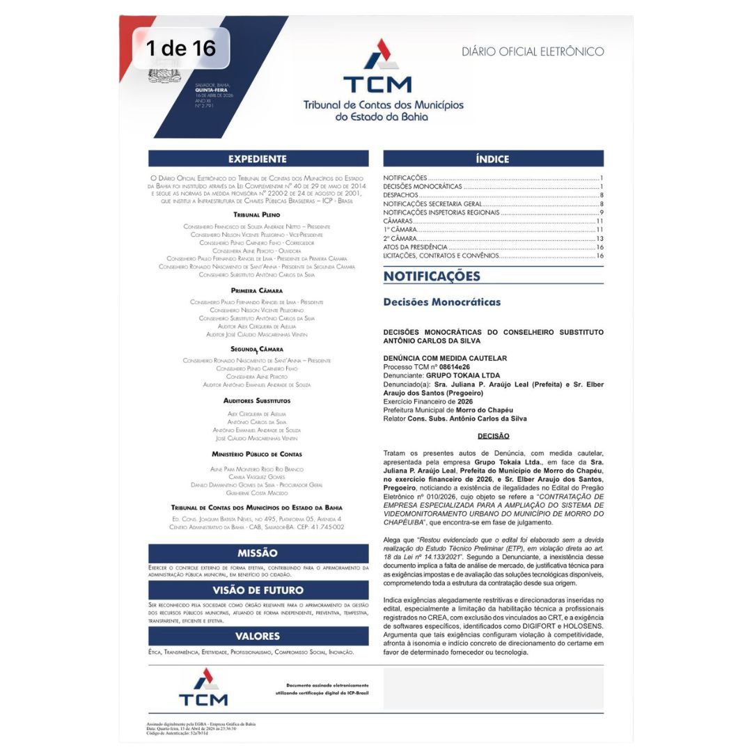 A denúncia foi apresentada pela empresa Grupo Tokaia Ltda. e tem como responsáveis citados a prefeita Juliana Araújo (PSD) e o pregoeiro Elber Araújo dos Santos. O caso está relacionado ao Pregão Eletrônico nº 010/2026, que trata da contratação de empresa especializada para a ampliação do sistema de videomonitoramento urbano no município.