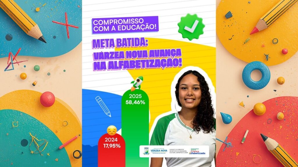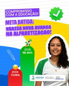 De acordo com os indicadores, Várzea Nova apresentou um salto expressivo. Em 2024, o município registrava 17,95% de crianças alfabetizadas. Já em 2025, o índice ultrapassou a meta estabelecida de 47,1%, chegando a 58,46%, representando um crescimento significativo e acima do esperado.