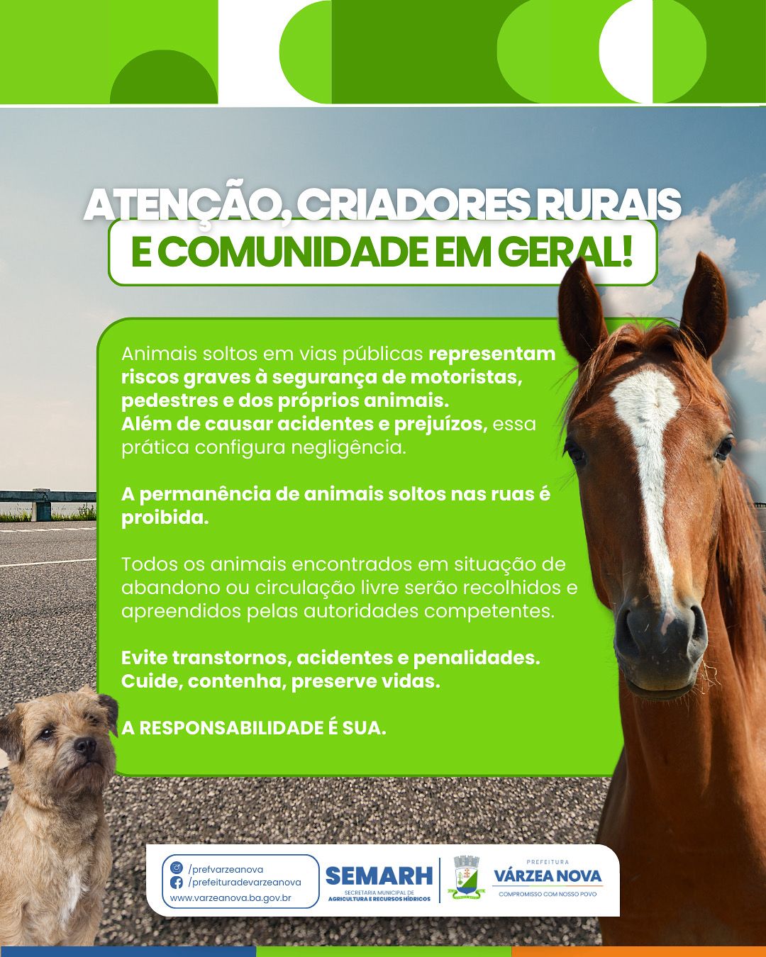 Em contato com a Assessoria de Comunicação da Prefeitura de Várzea Nova, recebemos a informação de que uma campanha de conscientização dos criadores de cães, gatos e animais de grande porte já vem acontecendo na cidade, tanto pelas redes sociais quanto com mensagens em carros de som, alertando sobre o problema e o próximo passo, seguindo o código de postura do município, é a apreensão dos animais e multa aos proprietários que só os resgatarão após o pagamento.