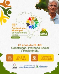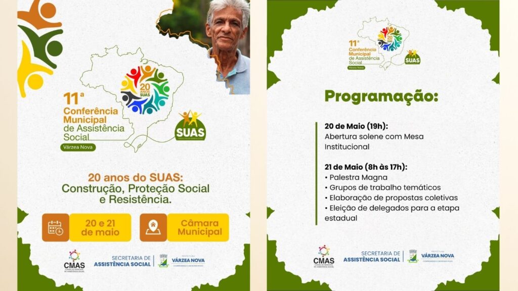 A Prefeitura de Várzea Nova, por meio da Secretaria Municipal de Assistência Social, convida toda a população para participar da Conferência Municipal de Assistência Social, que será realizada nos dias 20 e 21 de maio (terça e quarta-feira), na Câmara Municipal de Vereadores.