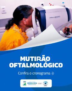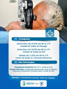 A Prefeitura de Várzea Nova, por meio da Secretaria Municipal de Saúde, realizará um mutirão oftalmológico entre os dias 25 e 27 de setembro. A ação tem como objetivo ampliar o acesso da população a exames especializados e contribuir para o diagnóstico precoce de doenças oculares.