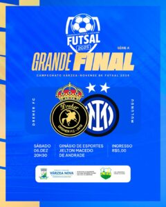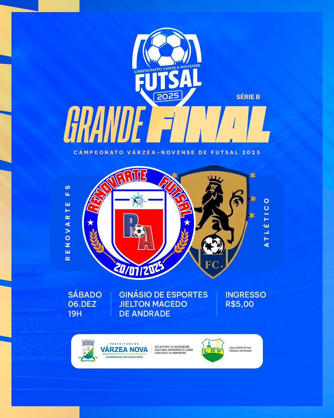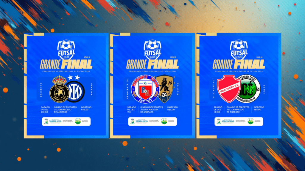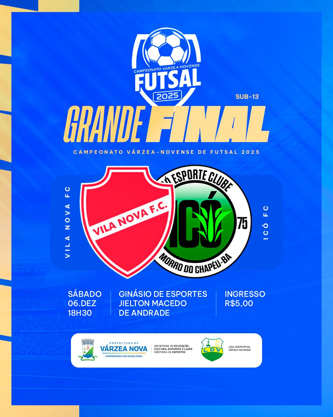 A Prefeitura de Várzea Nova realiza neste sábado, 06/12, a grande final do Campeonato Várzea-novense de Futsal, evento que tem fortalecido a prática esportiva e mobilizado a comunidade ao longo de toda a temporada. A programação contará com três partidas decisivas e deve reunir um grande público no ginásio municipal.