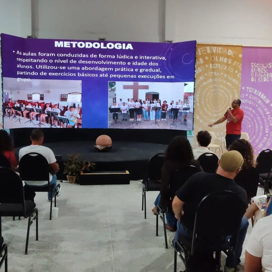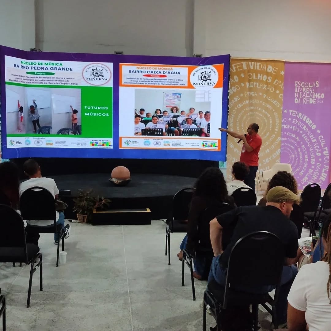 ‘Desde o dia 26 a 30 de maio, o maestro e professor da Escola de Música da SOCIEDADE FILARMÔNICA MINERVA, Alberto Caetano, esteve participando do grande Encontro das Escolas Livres realizado pelo Ministério da Cultura, na cidade de Fortaleza (CE) com a finalidade de apresentar os resultados do projeto dos Núcleos Musicais da Minerva, executado entre o mês de junho/2024 e abril/2025 nos bairros da Caixa D’água e da Pedra Grande, nesta cidade. É a nossa cultura ultrapassando fronteiras.’